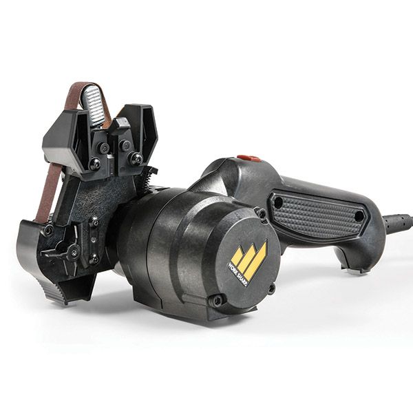 The Knife & Tool Sharpener mk.2 builds on the success of the Original Knife & Tool Sharpener and offers even more features and ease of use. It was designed to sharpen every knife you own. Using flexible abrasive belts, the sharpener is able to sharpen not just straight bladed knives, but also curved knives, tanto blades, filet knives, serrated knives, gut hooks, scissors, axes, mower blades, and more. Precision angle sharpening guides ensure that you get the proper angle every time. Multiple speeds allows for the optimal amount of material take off..